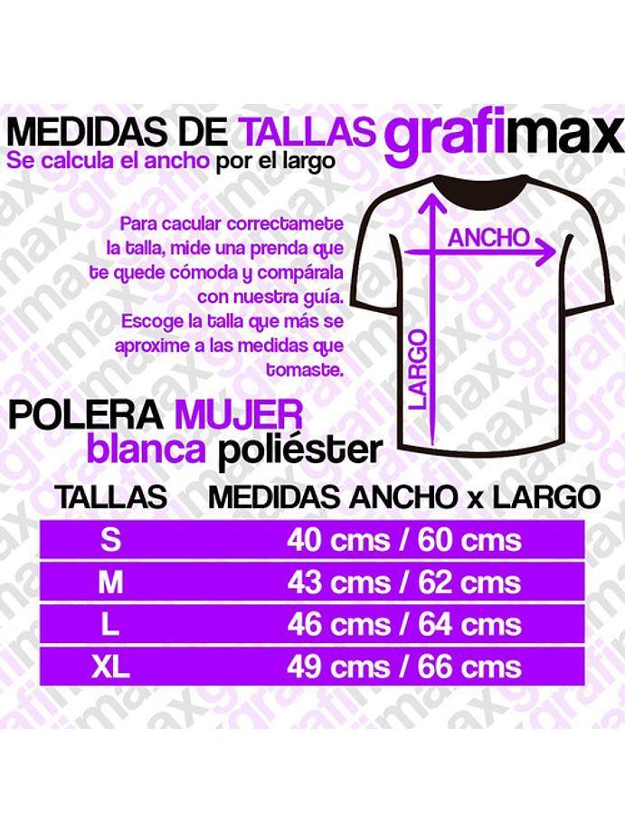 Polera de manga corta con cuello redondo de 4 capas, costura reforzada en cuello y hombros. Composición: 100% Poliéster punto liso, 165 g/m², estampado mediante Sublimación de alta resistencia, gracias a esto, el resultado es un producto de calidad profesional, de gran duración y resistencia a los lavados, que no se destiñe ni se deforma con el paso del tiempo. ¿Cómo tomar las medidas? Para tomar correctamente la talla, toma una de tus poleras, ponla sobre una superficie recta y mide desde debajo de la axila de un extremo a otro para saber el ancho. Para saber el largo, mide desde el cuello hasta la parte inferior. Una vez tengas esas medidas, compáralas con nuestra guía de tallas para corroborar la ideal para ti. ¿Por qué comprar en Grafimax? - Productos de la más alta calidad y durabilidad.